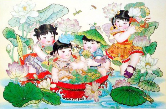 在我的年画中,我最喜欢的一幅是由步万方作的《采莲图》,长77厘米,宽53厘米,由天津杨柳青画店于1978年9月出版印刷,售价0.11元。画面中,荷花送香、荷叶田田、青蛙欢跳的荷塘里,四个脸庞红润、身体壮实的儿童,正兴趣盎然地在荷塘里采摘莲蓬。他们中的三人分坐在两个红木盆里,盆里装满了莲蓬,还有一人站在水里,她刚摘了一大把莲蓬,正抬脚往盆边走来。两只蜻蜓在荷塘上空翩翩飞舞,孩子们快乐地说笑着。这幅年画,构思巧妙,线条流畅,设色工整清丽,画境活泼轻快,且“莲”与连同音,儿童喜庆,莲蓬多子,莲花、莲蓬和儿童组合在一起,有连生贵子的寓意,寄托着后代子孙兴旺的理想。