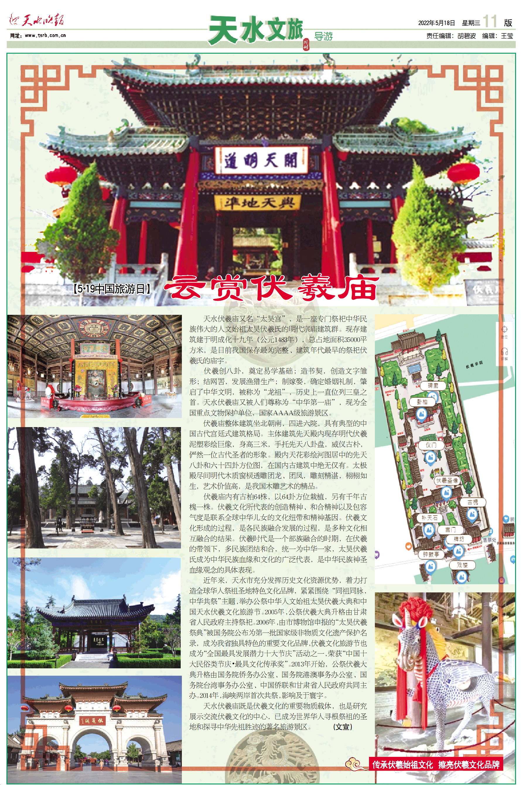 天水伏羲庙既是伏羲文化的重要物质载体,也是研究展示交流伏羲文化的中心,已成为世界华人寻根祭祖的圣地和探寻中华先祖胜迹的著名旅游景区。 (文宣)