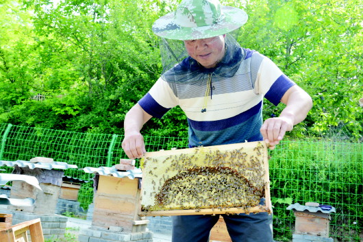 6月2日,在后寺村中蜂养殖基地,村支部书记闫旺全头戴防护帽正忙着逐个查看蜂箱。打开盖板、取出巢皮,仔细观察蜜蜂状态,无异常后小心翼翼地放回蜂巢中。