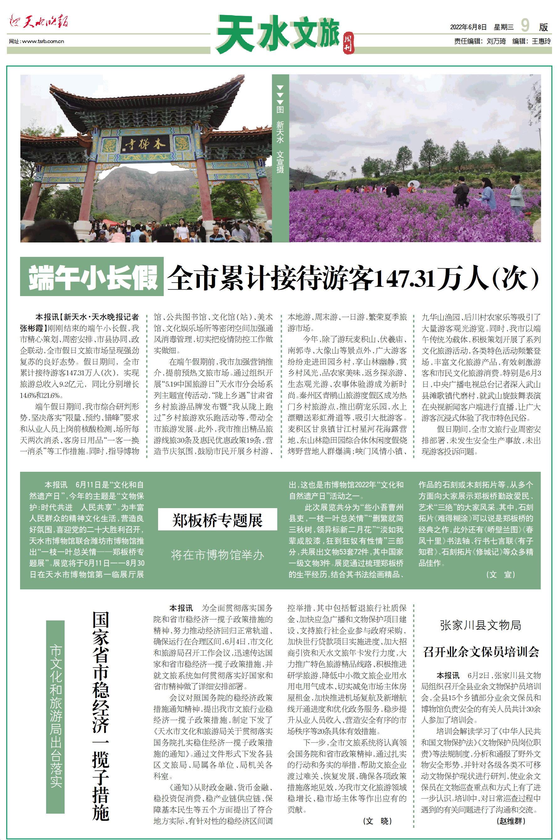《通知》从财政金融、货币金融、稳投资促消费、稳产业链供应链、保障基本民生等五个方面提出了符合地方实际、有针对性的稳经济区间调控举措,其中包括暂退旅行社质保金、加快应急广播和文物保护项目建设、支持旅行社企业参与政府采购,加快世行贷款项目实施进度、加大招商引资和天水文旅年卡发行力度,大力推广特色旅游精品线路、积极推进研学旅游,降低中小微文旅企业用水用电用气成本、切实减免市场主体房屋租金,加快推进机场复航及新增航线开通进度和优化政务服务,稳步提升从业人员收入、营造安全有序的市场秩序等20条具体有效措施。