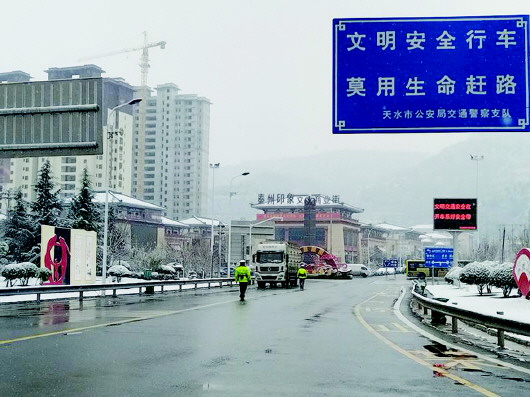 本报讯【新天水·天水晚报记者蔚军平】受冷空气和西南气流共同影响,12月9日夜间开始,我市出现大范围降雪天气,全市出现不同程度的积雪和道路结冰,我市交警、公路等部门闻雪而动,积极应对降雪天气保畅通。