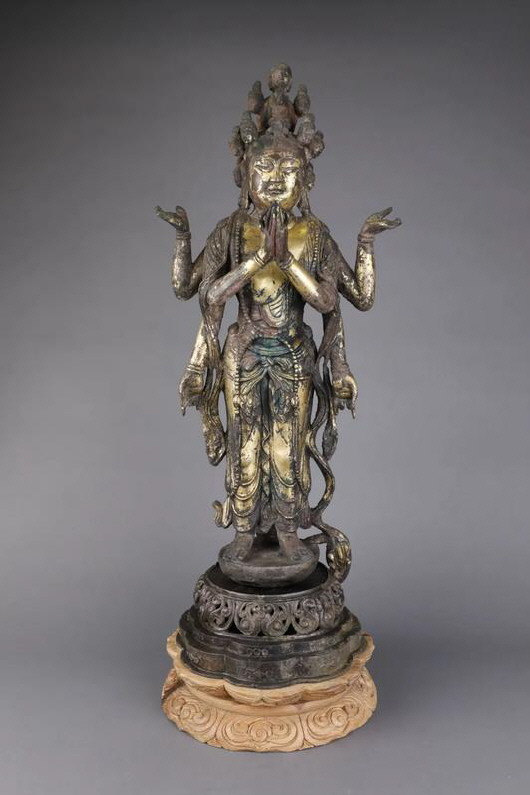 唐·鎏金十一面观音铜造像通高84.5厘米,铜质鎏金,观音跳足立于莲台上,头戴宝冠,冠上排列11尊菩萨头像。十一面观音像通常项上有五层十一面,其颜自下而上的三层每层皆有三面,正面的三面为“慧悲相”,意为看到行善众生而现慈悲欢喜相;左三面为“嗔怒相”,意为看到恶行众生时现出的大悲救苦相;右三面为“劝进相”,意为看到净业众生时引发的赞叹相。自下而上的第四层为“怪笑相”,为使世间众生弃恶行善而出现。最上一层是“说法像”,是主尊阿弥陀佛为度众生所做的传法之相。