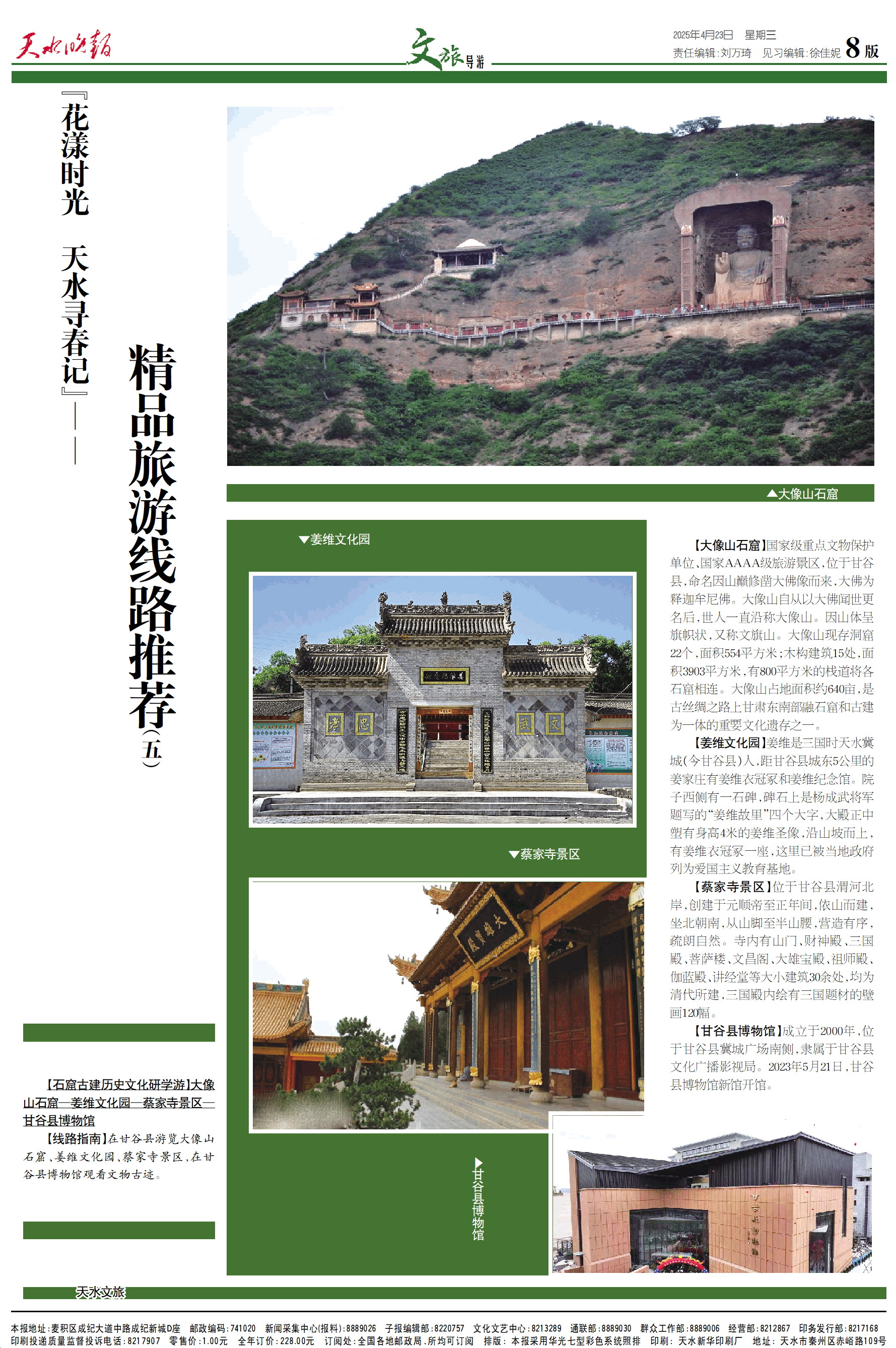 【线路指南】在甘谷县游览大像山石窟、姜维文化园、蔡家寺景区,在甘谷县博物馆观看文物古迹。