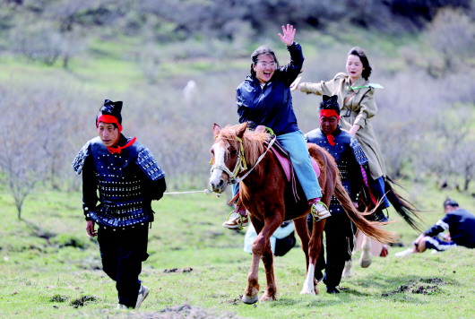 “五一”假期,清水县非子牧场山清水秀,景色宜人,游客骑马驰骋,感受大秦遗风,在欢声笑语中体验草原生活的乐趣。 王卫东 摄