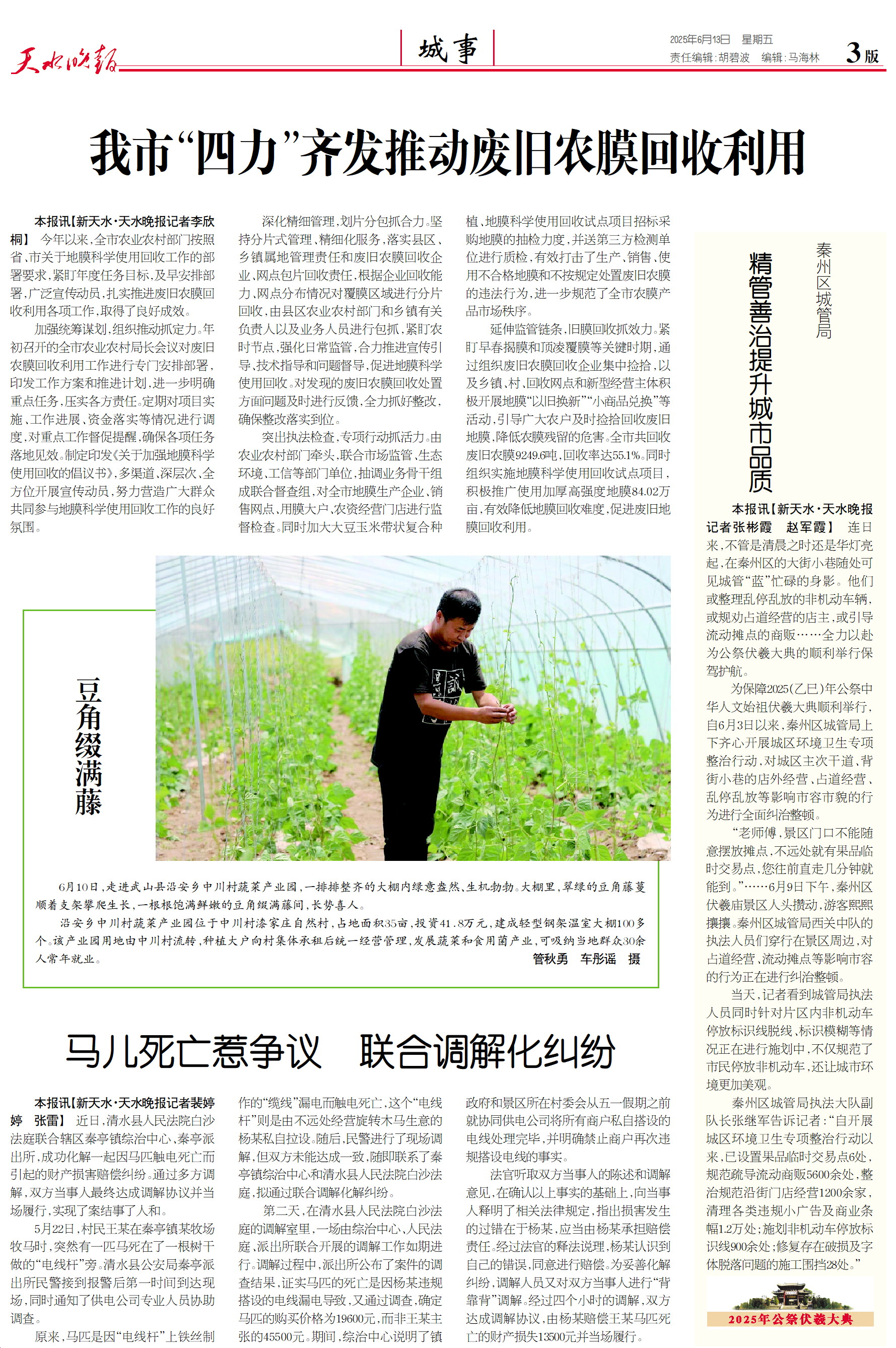本报讯【新天水·天水晚报记者李欣桐】 今年以来,全市农业农村部门按照省、市关于地膜科学使用回收工作的部署要求,紧盯年度任务目标,及早安排部署,广泛宣传动员,扎实推进废旧农膜回收利用各项工作,取得了良好成效。