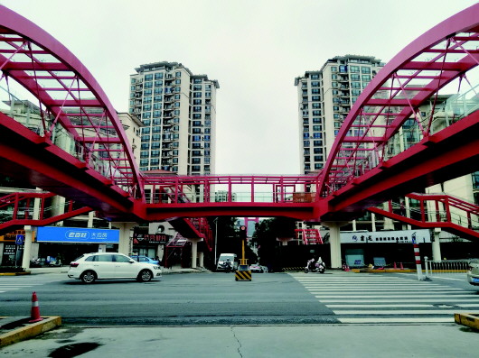 据介绍,人行天桥南北向主跨为35米、东西向主跨为21米,总宽3.4米,净宽3.0米。主跨采用钢箱梁,梯道采用1:2.5坡度,净高>5.2米。主跨建筑面积395.3平方米,梯道建筑面积为305.9平方米,建筑总面积为701.2平方米。同时,在路口预留4部无障碍直梯位置。