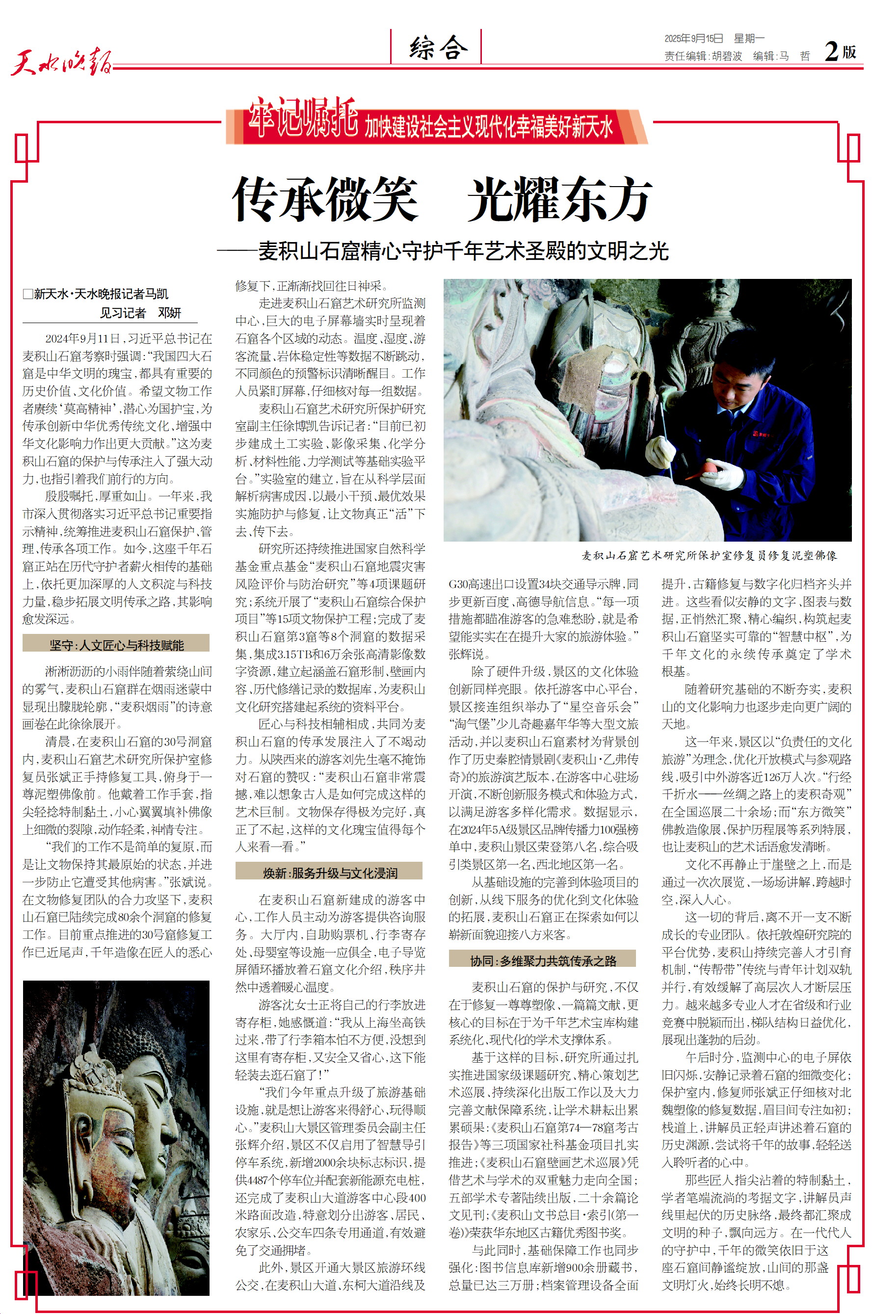 殷殷嘱托,厚重如山。一年来,我市深入贯彻落实习近平总书记重要指示精神,统筹推进麦积山石窟保护、管理、传承各项工作。如今,这座千年石窟正站在历代守护者薪火相传的基础上,依托更加深厚的人文积淀与科技力量,稳步拓展文明传承之路,其影响愈发深远。