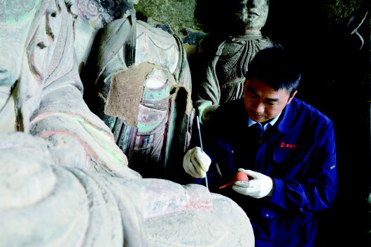 麦积山石窟艺术研究所保护室修复员修复泥塑佛像