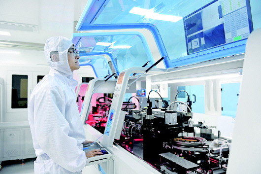 10月16日,陕西电子天水天光半导体有限责任公司塑封事业部的工人在生产线上工作。