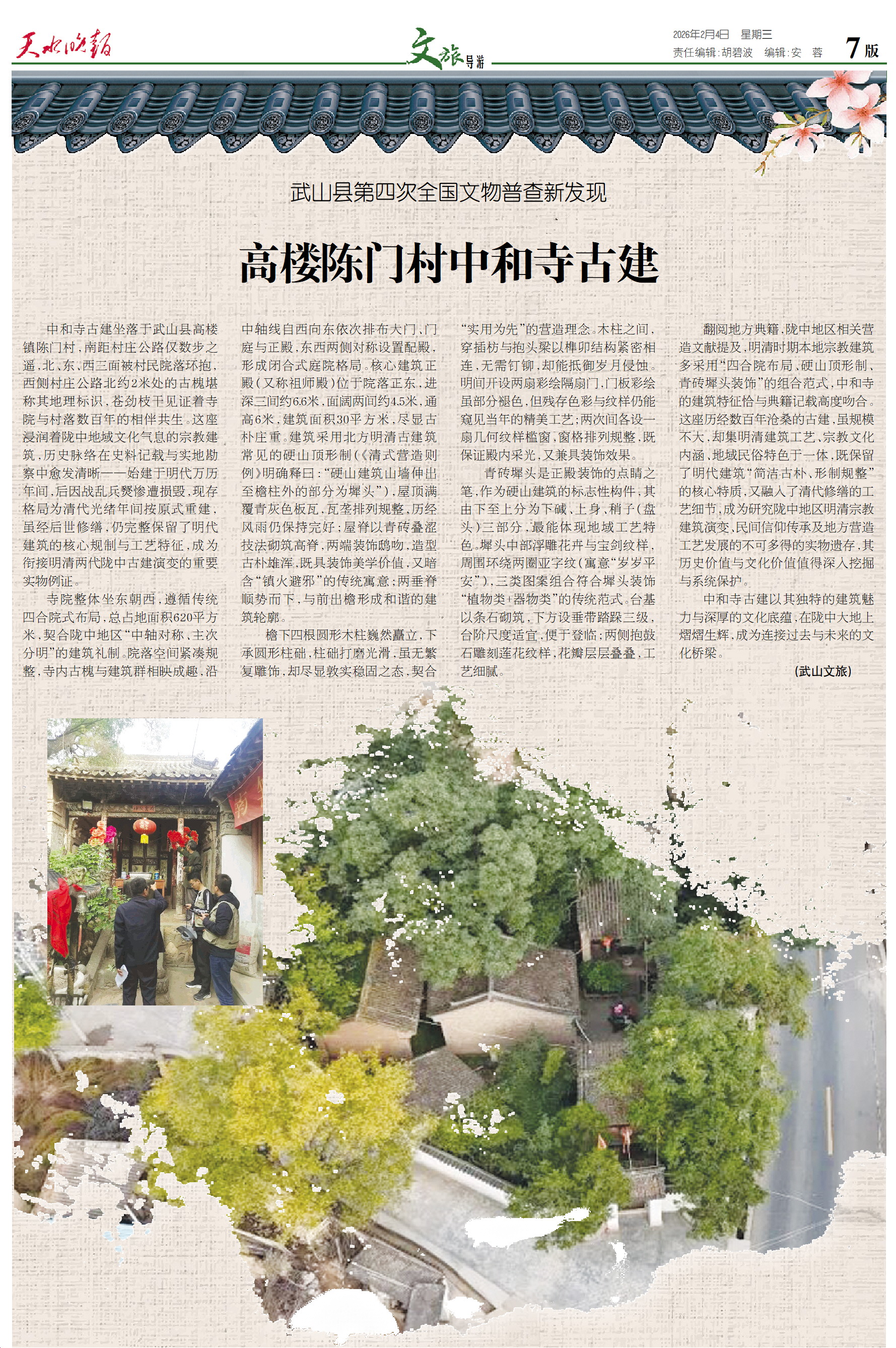 中和寺古建坐落于武山县高楼镇陈门村,南距村庄公路仅数步之遥,北、东、西三面被村民院落环抱,西侧村庄公路北约2米处的古槐堪称其地理标识,苍劲枝干见证着寺院与村落数百年的相伴共生。这座浸润着陇中地域文化气息的宗教建筑,历史脉络在史料记载与实地勘察中愈发清晰——始建于明代万历年间,后因战乱兵燹惨遭损毁,现存格局为清代光绪年间按原式重建,虽经后世修缮,仍完整保留了明代建筑的核心规制与工艺特征,成为衔接明清两代陇中古建演变的重要实物例证。