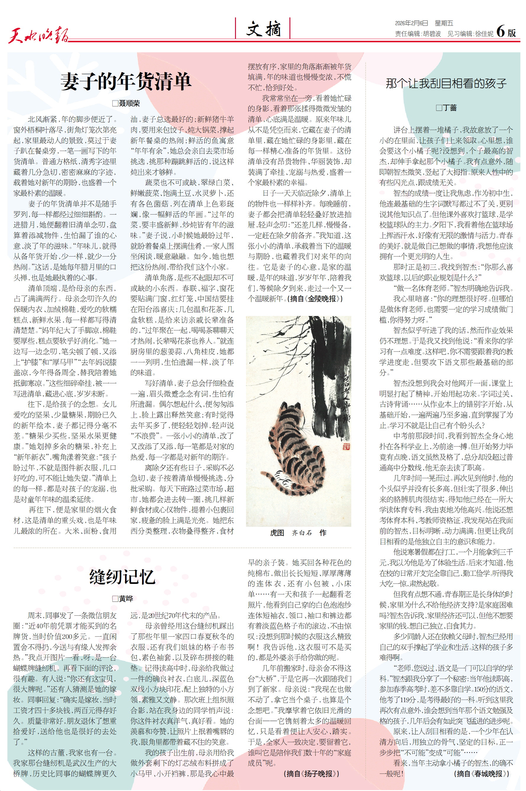 日子一天天临近除夕,清单上的物件也一样样补齐。每晚睡前,妻子都会把清单轻轻叠好放进抽屉,轻声念叨:“还差几样,慢慢备,一定赶在除夕前备齐。”我知道,这张小小的清单,承载着当下的温暖与期盼,也藏着我们对来年的向往。它是妻子的心意,是家的温暖,是年的味道,岁岁年年,陪着我们,等候除夕到来,走过一个又一个温暖新年。(摘自《金陵晚报》)