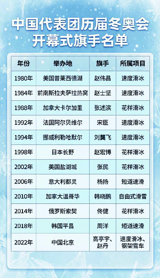 自此,中国冰雪迈开追赶步伐:1992年阿尔贝维尔冬奥会,叶乔波连夺两枚银牌实现中国队冬奥奖牌“零的突破”;2002年盐湖城冬奥会,杨扬夺得中国队冬奥首金,2006年都灵冬奥会她成为中国首位冬奥女旗手、首位冬奥冠军旗手;同年都灵冬奥会,韩晓鹏成为中国首位雪上项目冬奥冠军,2010年温哥华冬奥会他作为首位雪上项目旗手为国擎旗;2014年索契冬奥会,34岁的佟健创造中国冬奥旗手年龄之最;2018年平昌冬奥会,手握三枚冬奥金牌的周洋成为首位“多金王”旗手;2022年北京冬奥会,高亭宇与赵丹采用双旗手模式入场,高亭宇夺得中国首位男子速度滑冰冬奥金牌,赵丹后续也为中国钢架雪车女子项目夺得首枚世界杯金牌。