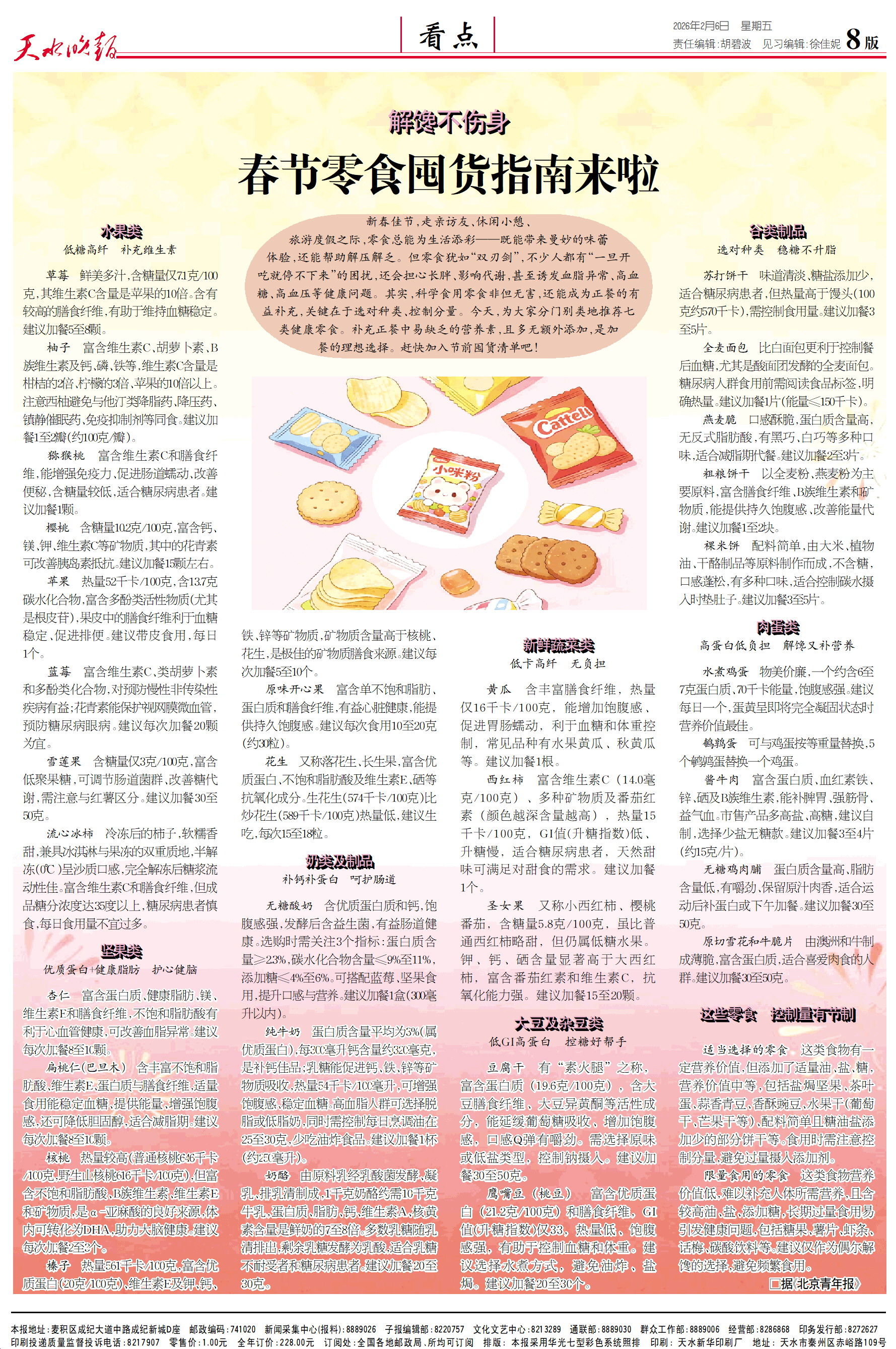 新春佳节,走亲访友、休闲小憩、旅游度假之际,零食总能为生活添彩——既能带来曼妙的味蕾体验,还能帮助解压解乏。但零食犹如“双刃剑”,不少人都有“一旦开吃就停不下来”的困扰,还会担心长胖、影响代谢,甚至诱发血脂异常、高血糖、高血压等健康问题。其实,科学食用零食非但无害,还能成为正餐的有益补充,关键在于选对种类、控制分量。今天,为大家分门别类地推荐七类健康零食。补充正餐中易缺乏的营养素,且多无额外添加,是加餐的理想选择。赶快加入节前囤货清单吧!