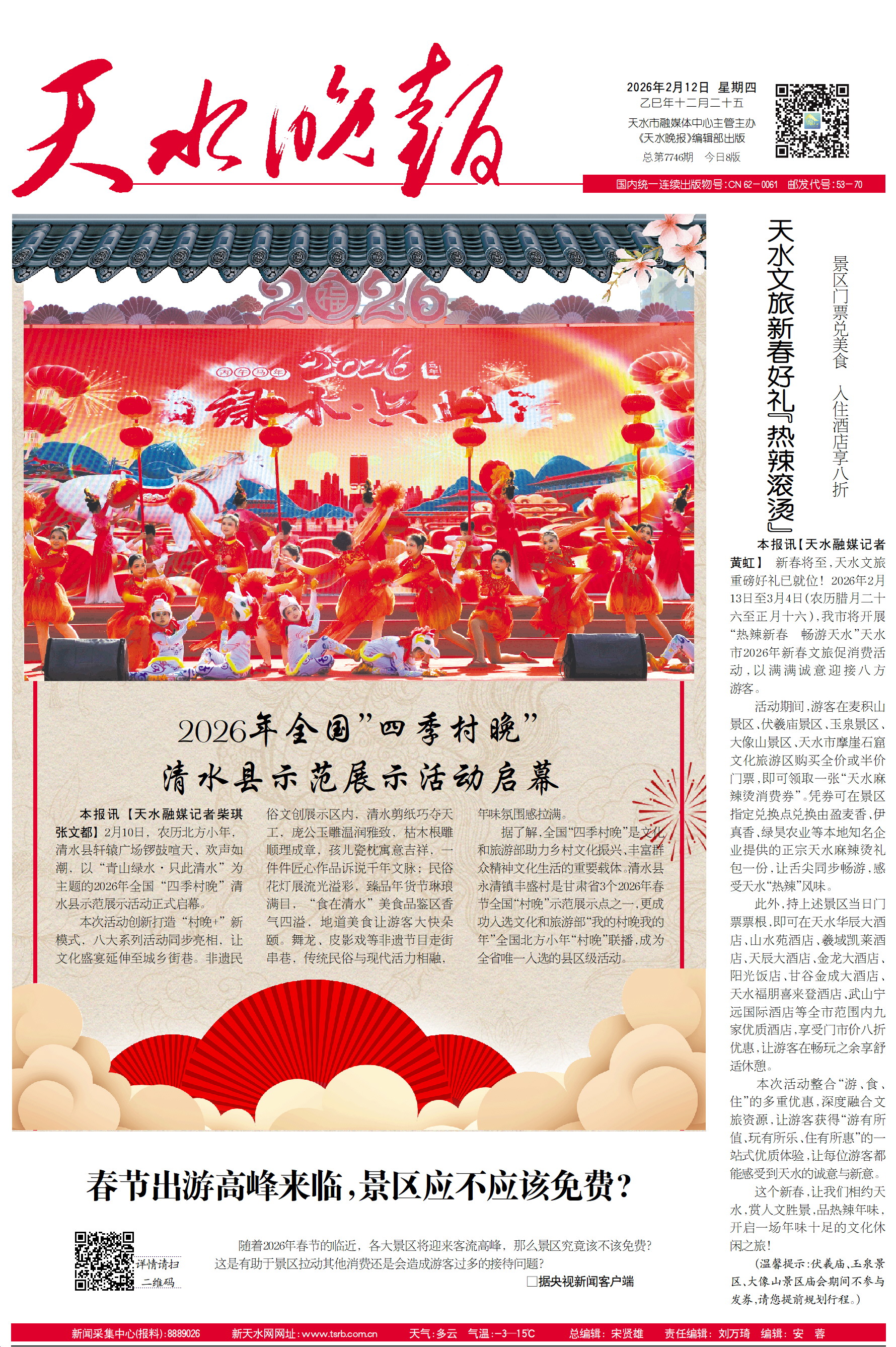 本报讯【天水融媒记者 黄虹】 新春将至,天水文旅重磅好礼已就位!2026年2月13日至3月4日(农历腊月二十六至正月十六),我市将开展“热辣新春 畅游天水”天水市2026年新春文旅促消费活动,以满满诚意迎接八方游客。