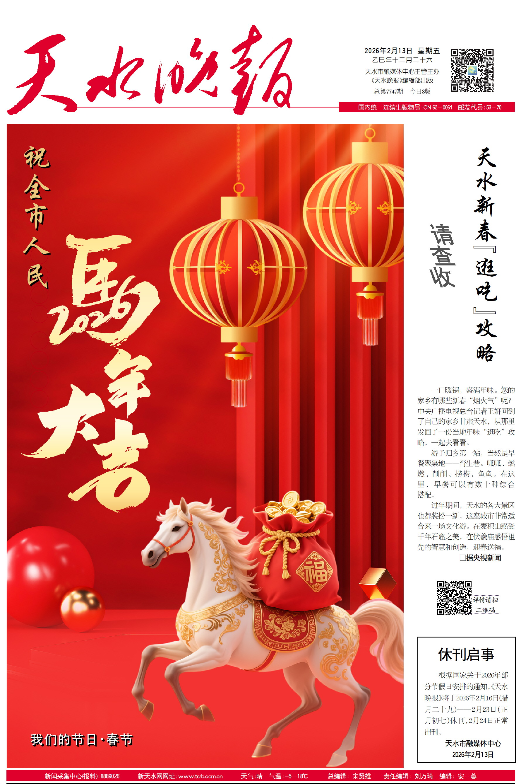 根据国家关于2026年部分节假日安排的通知,《天水晚报》将于2026年2月16日(腊月二十九)——2月23日(正月初七)休刊,2月24日正常出刊。
