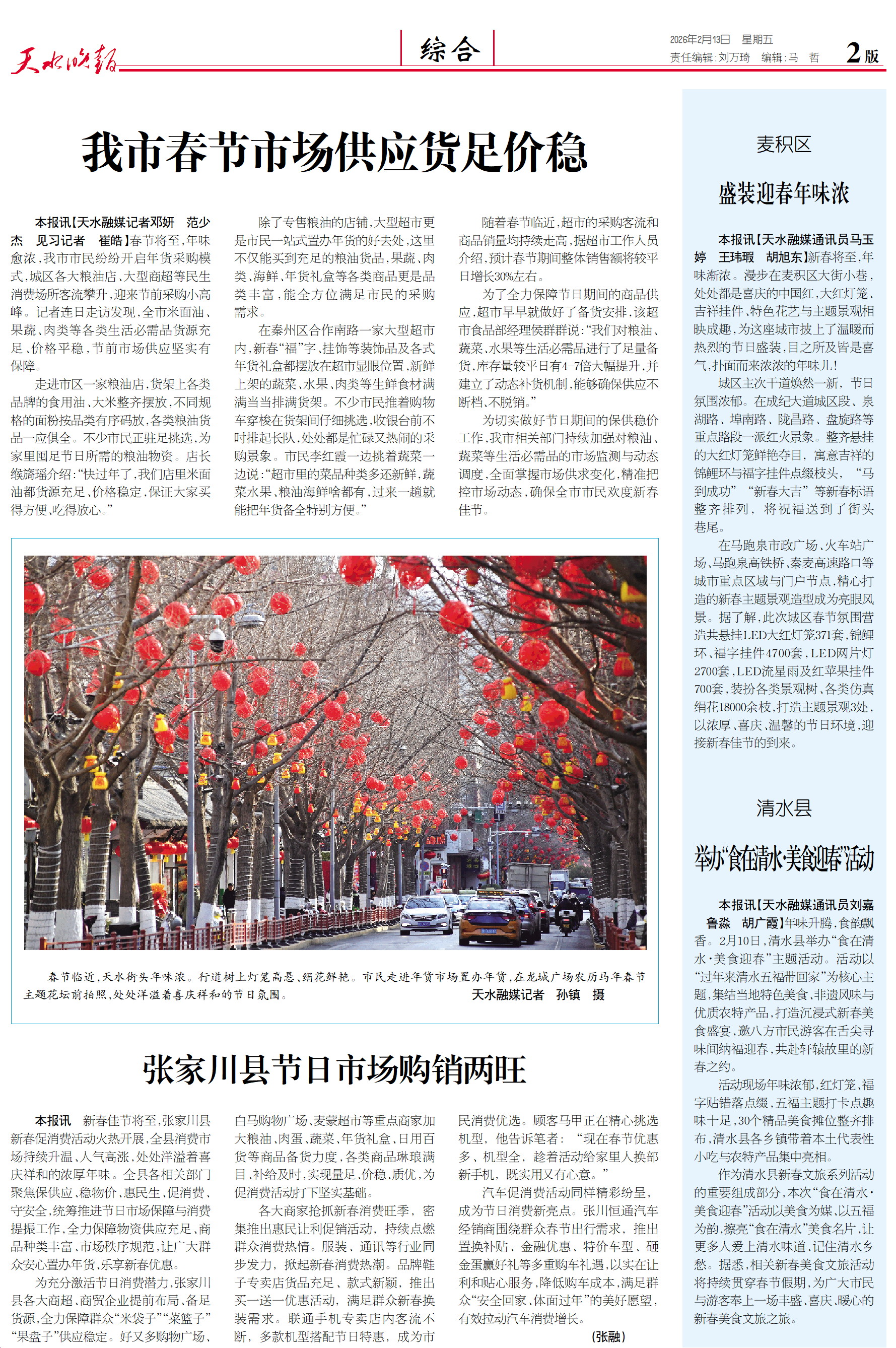 城区主次干道焕然一新,节日氛围浓郁。在成纪大道城区段、泉湖路、埠南路、陇昌路、盘旋路等重点路段一派红火景象。整齐悬挂的大红灯笼鲜艳夺目,寓意吉祥的锦鲤环与福字挂件点缀枝头,“马到成功”“新春大吉”等新春标语整齐排列,将祝福送到了街头巷尾。