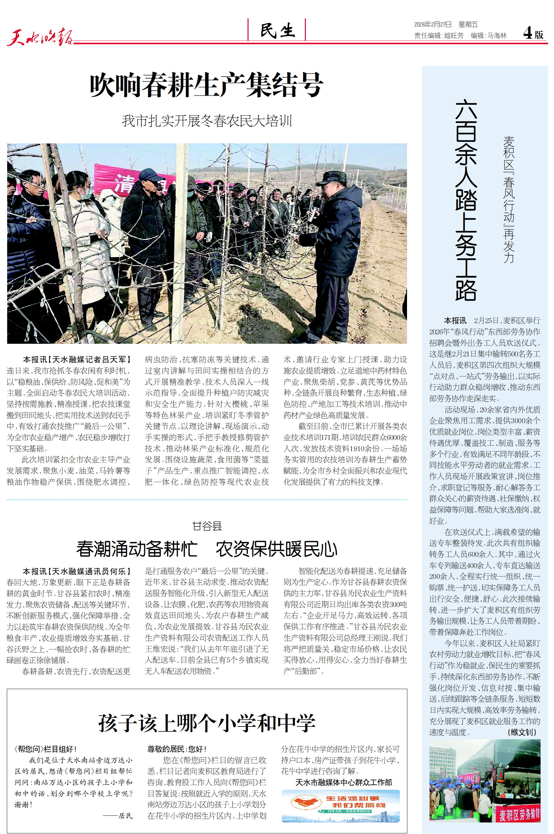 智能化配送为春耕提速,充足储备则为生产定心。作为甘谷县春耕农资保供的主力军,甘谷县为民农业生产资料有限公司近期日均出库各类农资300吨左右。“企业开足马力、高效运转,各项保供工作有序推进。”甘谷县为民农业生产资料有限公司总经理王刚说,我们将严把质量关、稳定市场价格,让农民买得放心、用得安心,全力当好春耕生产“后勤部”。