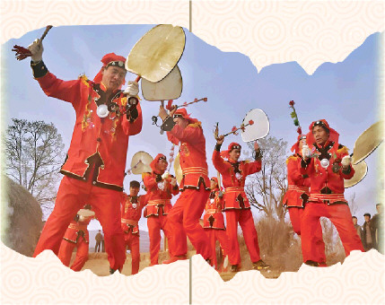 “嘭—嚓嚓—嘭—嚓嚓—”广场上响起了疾风暴雨般的鼓声。几十个年轻后生左手举鼓,右手执鞭、边舞边打,鼓声激越、坠环“嚓嚓”作响。他们在大鼓手的指挥下忘情地击鼓、呐喊……霎时,鸟雀惊飞、尘土激扬,惹得围观的人群发出山洪般的呐喊。