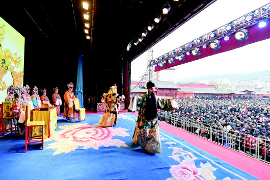 当天中午时分,广大戏迷提着马扎、板凳,从四面八方来到伏羲广场,看大戏过春节。舞台上,戏曲演员们倾情演出,唱腔浑厚,曲声悠扬。在幕后,候场的演员精心妆造、准备行头。