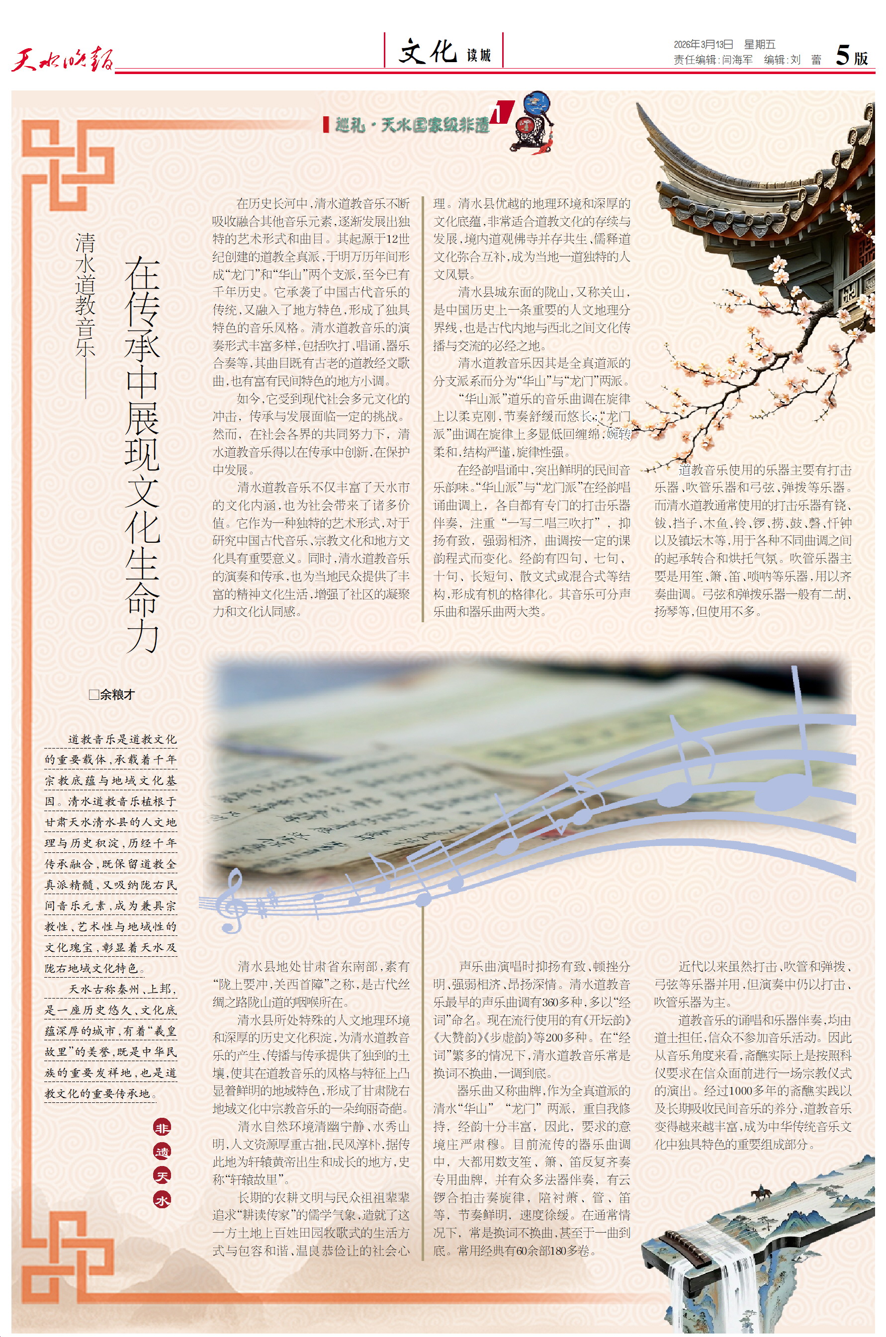 道教音乐是道教文化的重要载体,承载着千年宗教底蕴与地域文化基因。清水道教音乐植根于甘肃天水清水县的人文地理与历史积淀,历经千年传承融合,既保留道教全真派精髓,又吸纳陇右民间音乐元素,成为兼具宗教性、艺术性与地域性的文化瑰宝,彰显着天水及陇右地域文化特色。