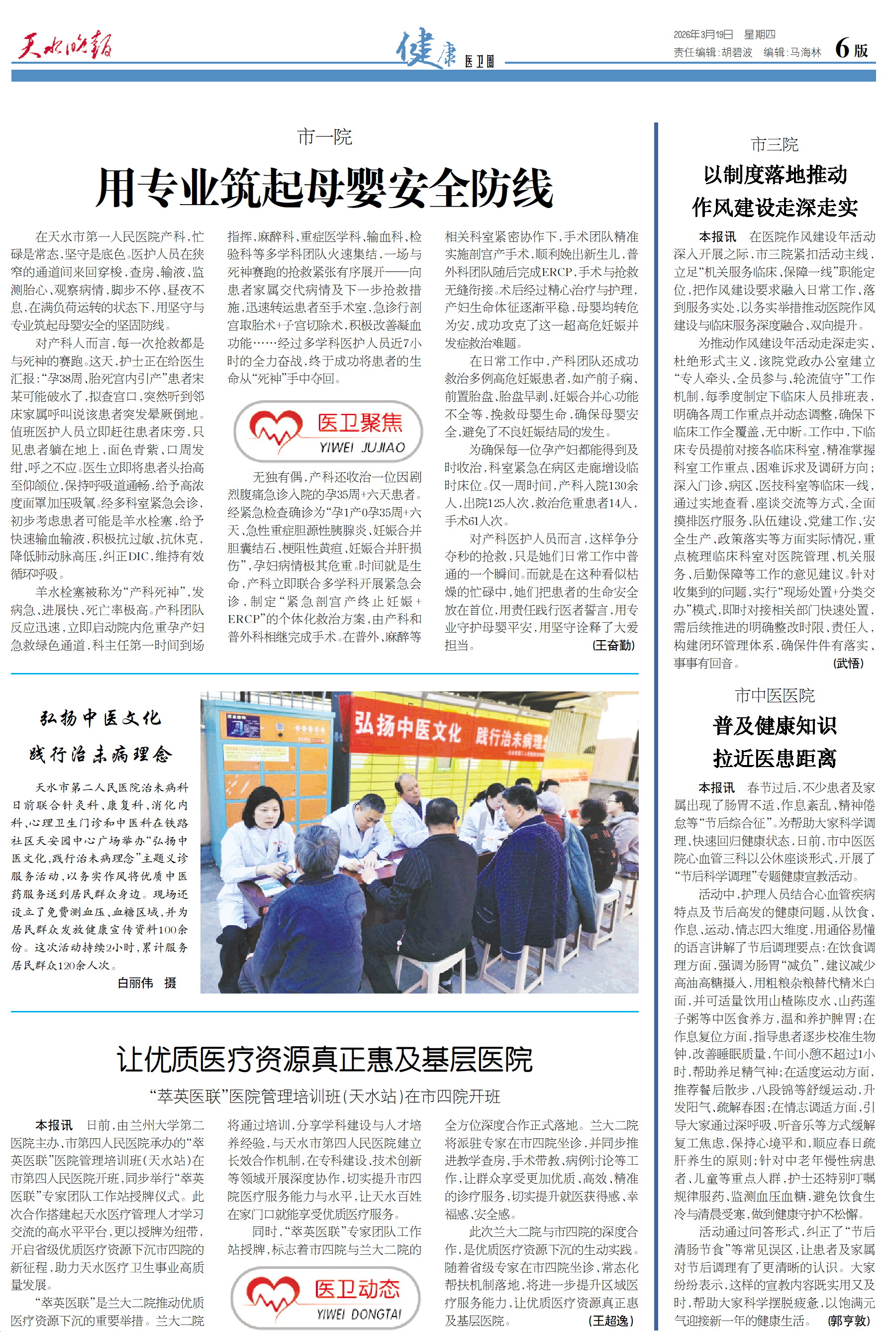 天水市第二人民医院治未病科日前联合针灸科、康复科、消化内科、心理卫生门诊和中医科在铁路社区天安园中心广场举办“弘扬中医文化,践行治未病理念”主题义诊服务活动,以务实作风将优质中医药服务送到居民群众身边。现场还设立了免费测血压、血糖区域,并为居民群众发放健康宣传资料100余份。这次活动持续2小时,累计服务居民群众120余人次。