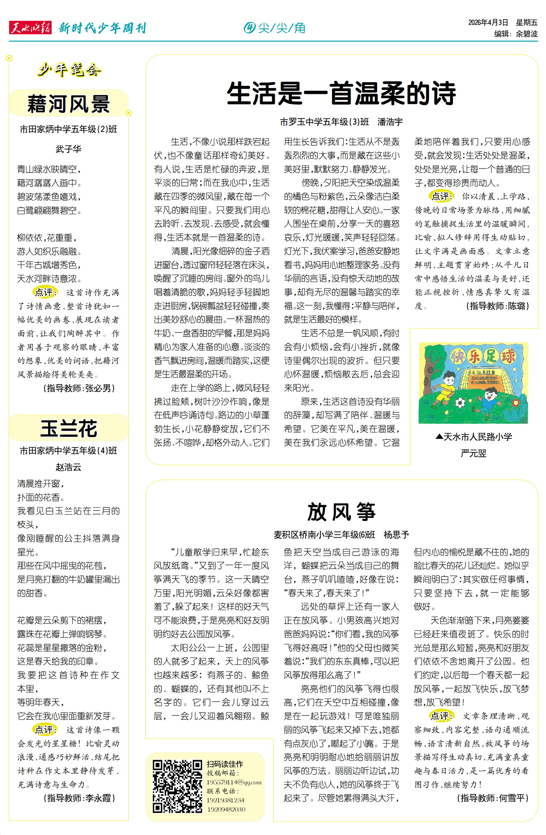 点评: 这首诗像一颗会发光的星星糖!比喻灵动浪漫,通感巧妙鲜活,结尾把诗种在作文本里静待发芽,充满诗意与生命力。