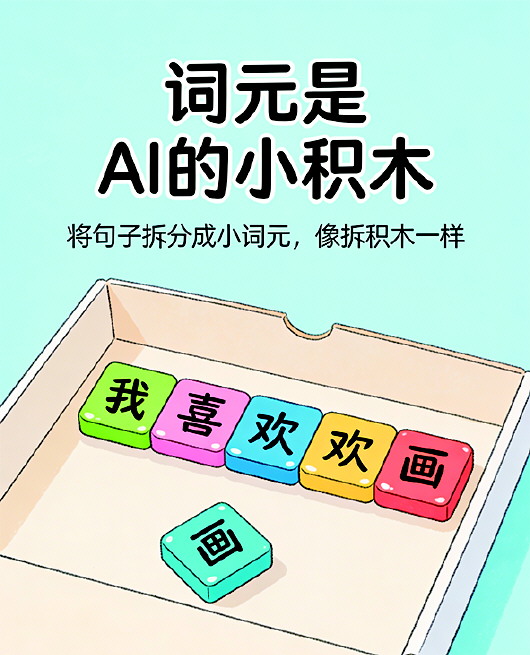 比如我们说“我喜欢画画”,AI不会一下子看懂整句话,会把它拆成“我”“喜”“欢”“画”“画”这些小词元,像拆积木一样,拼起来慢慢理解。